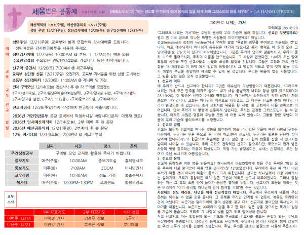 20251214 주보 페이지 정보 작성자 나성한미교회 댓글 0건 조회 73회 작성일 25-12-12 16:17 목록 본문 20251214 주보 다음글20251207 주보 25.12.06 댓글 0 댓글목록 등록된 댓글이 없습니다. 목록