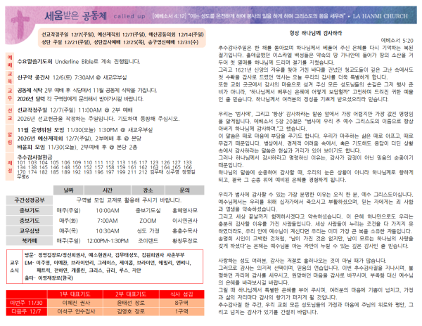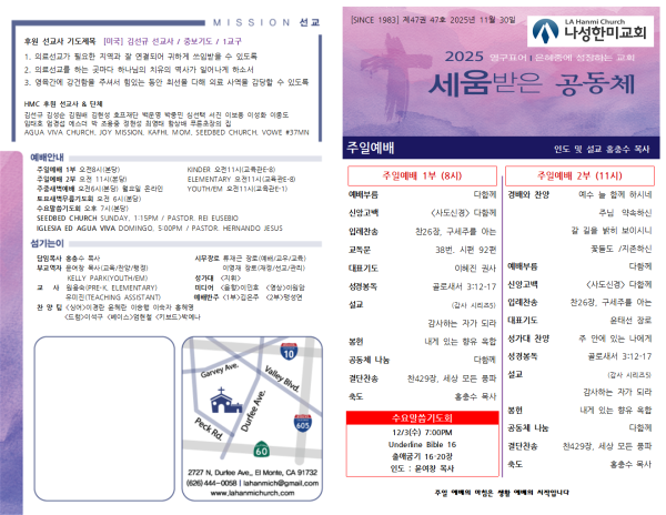 20251130 주보 페이지 정보 작성자 나성한미교회 댓글 0건 조회 39회 작성일 25-11-29 09:03 목록 본문 20251130 주보 다음글20251123 주보 25.11.21 댓글 0 댓글목록 등록된 댓글이 없습니다. 목록