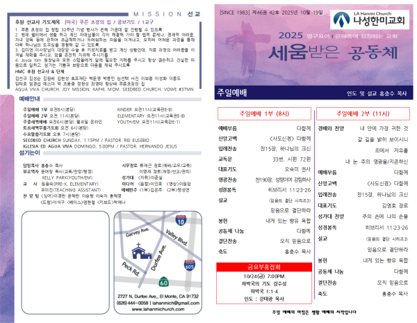 20251019 주보 페이지 정보 작성자 나성한미교회 댓글 0건 조회 5회 작성일 25-10-19 08:33 목록 본문 20251019 주보 다음글20251012 주보 25.10.11 댓글 0 댓글목록 등록된 댓글이 없습니다. 목록